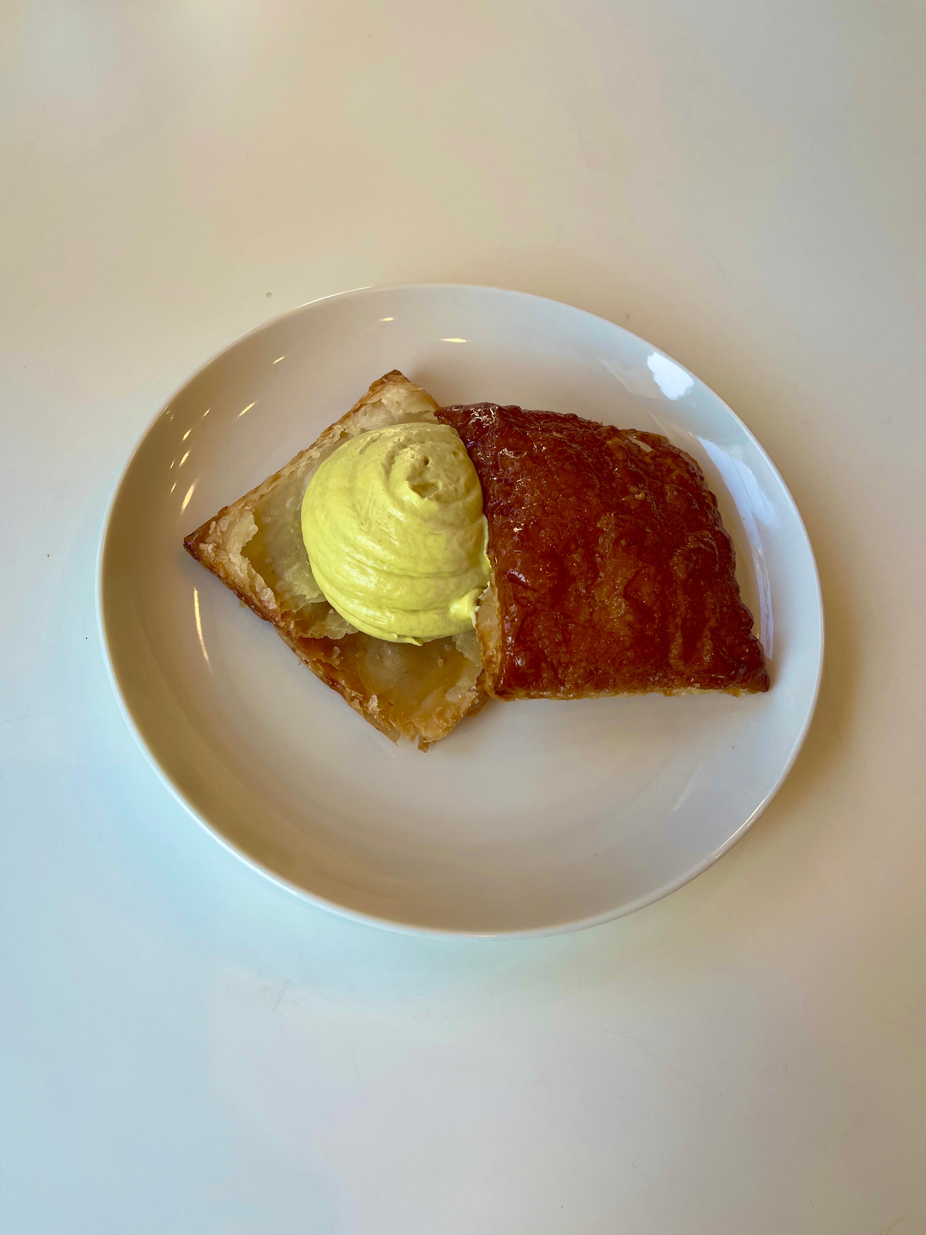 パリパリサクサクのパイ生地にcourirオリジナルのピスタチオカスタードクリームが詰められたピスタチオカスタードパイ